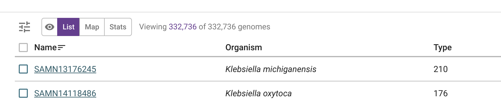 Sorting by "Country", "Type", and "Organism" has been disabled on the Genome view. Sorting by "Name" and "Date" is still available, which is now indicated by three horizontal lines in the column header.