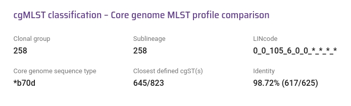 Notes: * This is the equivalent identity between the two profiles if they both have an allele assigned to every locus. There's a total of 629 loci in the Klebsiella pneumoniae complex cgMLST scheme.